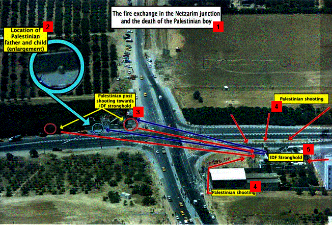 Der rote Kreis markiert die Position des Vaters mit seinem Sohn, die direkt neben einer Stellung palästinensischer Scharfschützen Deckung suchten. Nachdem palästinensische Polizisten von dieser Stellung aus und auch in der Umgebung davon Schüsse auf die israelische Stellung gegenüber abgegeben hatten, schossen israelische Soldaten dorthin zurück, wo die Schüsse hergekommen waren, und während dieses Schusswechsels wurde der Palästinenser-Junge anscheinend getötet.